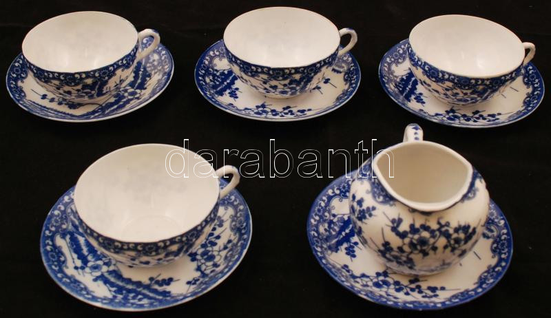 4 db keleti motÃvumos tojáshéj porcelán csésze + hozzá tartozó alj, kézzel festett, jelzett, apró kopásnyomokkal, d: 8,5 ill. 13 cm + 1 db keleti motÃvumos tojáshéj porcelán kiöntÅ‘, kézzel festett, jelzett, apró kopásnyomokkal, m: 7,5 cm + 1 db csészealj, kézzel festett, jelzett, apró kopásnyomokkal, d: 13 cm