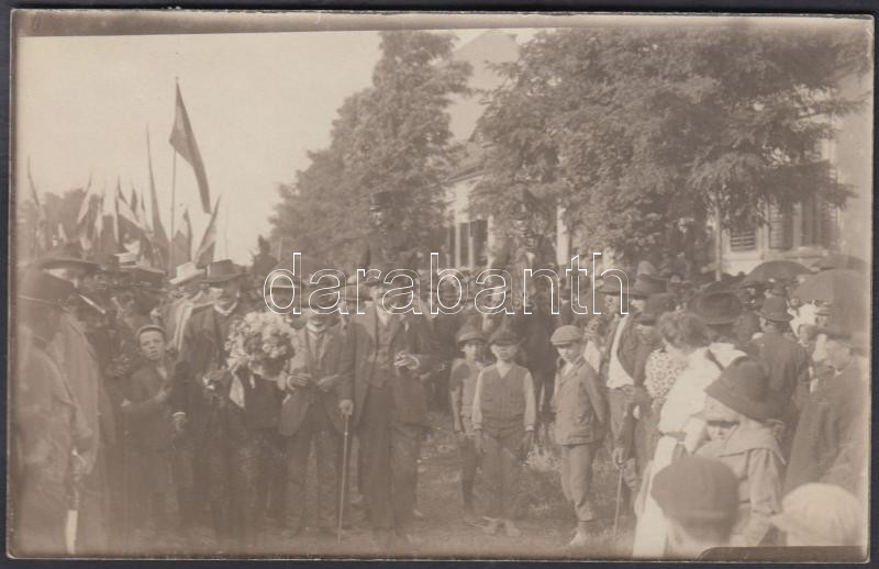1910 Hajdin Imre országgyűlési képviselő látogatása Szarvason (virágcsokor a kezében), fotólap megírva és neki címezve, postázva az esemény emlékére, 9x14 cm
