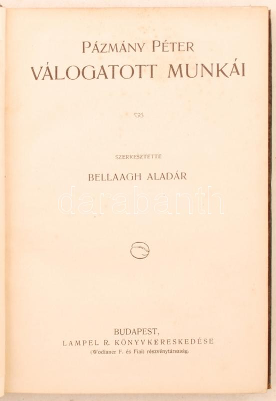 Pázmány Péter válogatott munkái. Szerk.: Bellaagh Aladár. Bp., [1906], Lampel R. Könyvkereskedése (Remekírók Képes Könyvtára). Díszes, aranyozott, vászonkötésben