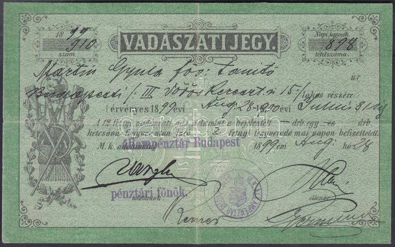 1899 Kitöltött vadászati jegy https://www.darabanth.com/hu/227-Gyorsarveres/227.0/Festmeny-mutargy-papirregiseg-egyeb/Okmanyok~200340/1899-Kitoltott-vadaszati-jegy~II1009805