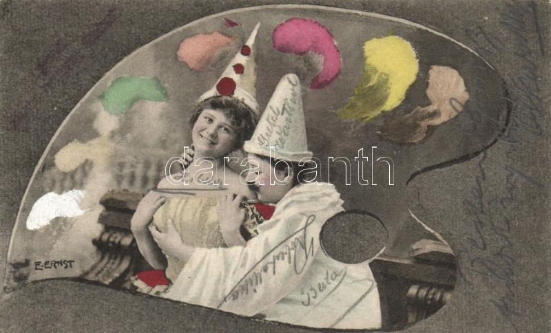 Clowns, paint palette s: E. Ernst (EK) https://www.darabanth.com/hu/227-Gyorsarveres/227.0/Kepeslapok/Cirkusz~600042/Clowns-paint-palette-s-E-Ernst-EK~II1007209