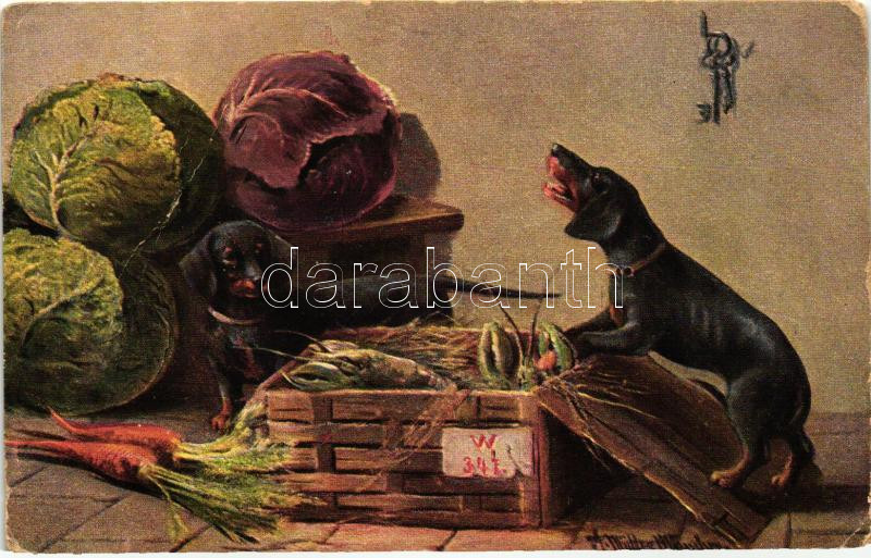 Dachshund dogswith vegetables s: Aug. Müller (EB) https://www.darabanth.com/hu/227-Gyorsarveres/227.0/Kepeslapok/Kutya~600075/Dachshund-dogswith-vegetables-s-Aug-Muller-EB~II1011404