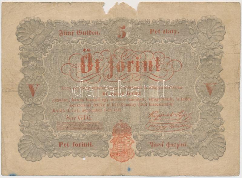 1848. 5Ft "Kossuth bankó" piros T:III-,IV https://www.darabanth.com/hu/227-Gyorsarveres/227.0/Numizmatika/Magyar-bankjegyek~600008/1848-5Ft-Kossuth-banko-piros-TIII-IV~II1003440