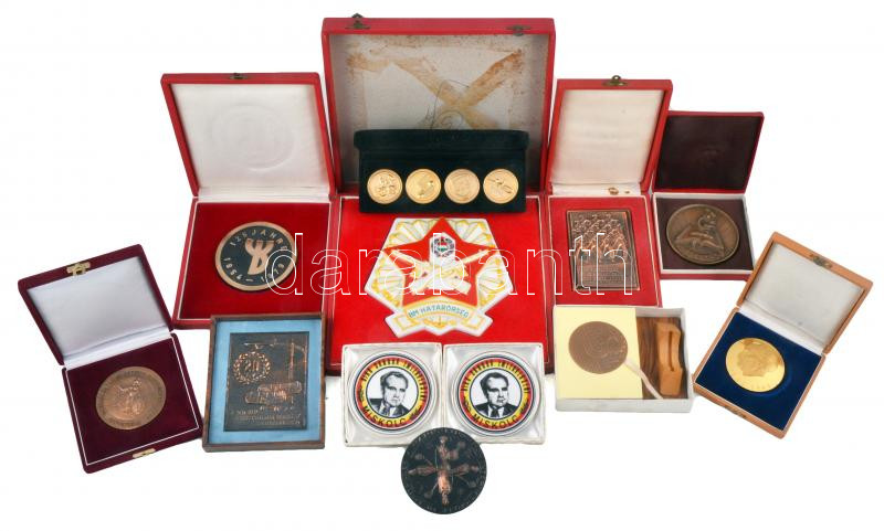 12db-os vegyes, magyar és külföldi emlékérem és plakett, egyet kivéve mind tokban, benne 2db porcelán. "BM Határőrség", "Biró Sándor emlékverseny", "Israel Industry Centenary" stb. T:vegyes