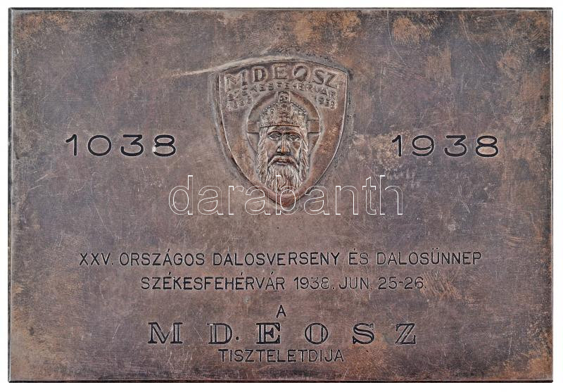 Leírás: 1938. "XXV. Országos Dalosverseny és Dalosünnep Székesfehérvár 1938. jun. 25-26. - MDEOSZ (Magyar Dalos Egyesületek Országos Szövetsége) tiszteletdíja" Br díj plakett (90x130mm) T:2