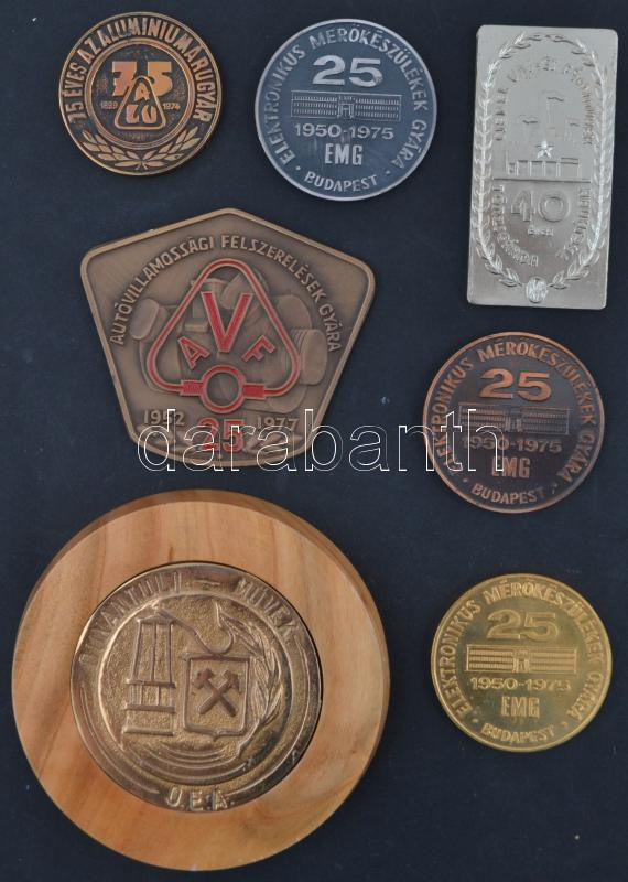Leírás: 7db szocialista plakett, vállalatok jubileumai alkalmából, egy kivételével mind tokban, közte 1977. "Autóvillamossági Felszerelések Gyára 1952-1977." Br plakett tokban (91x80mm), 1975. "Elektronikus Mérőkészülékek Gyára - Budapest 1950-1975." fém emlékérem tokban (55mm) T:2,2-