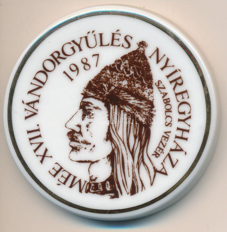 Leírás: Tóth Sándor (1933-) 1987. "MÉE XVII. Vándorgyűlés Nyíregyháza - Szabolcs Vezér" hollóházi porcelán emlékplakett (62mm) T:1-