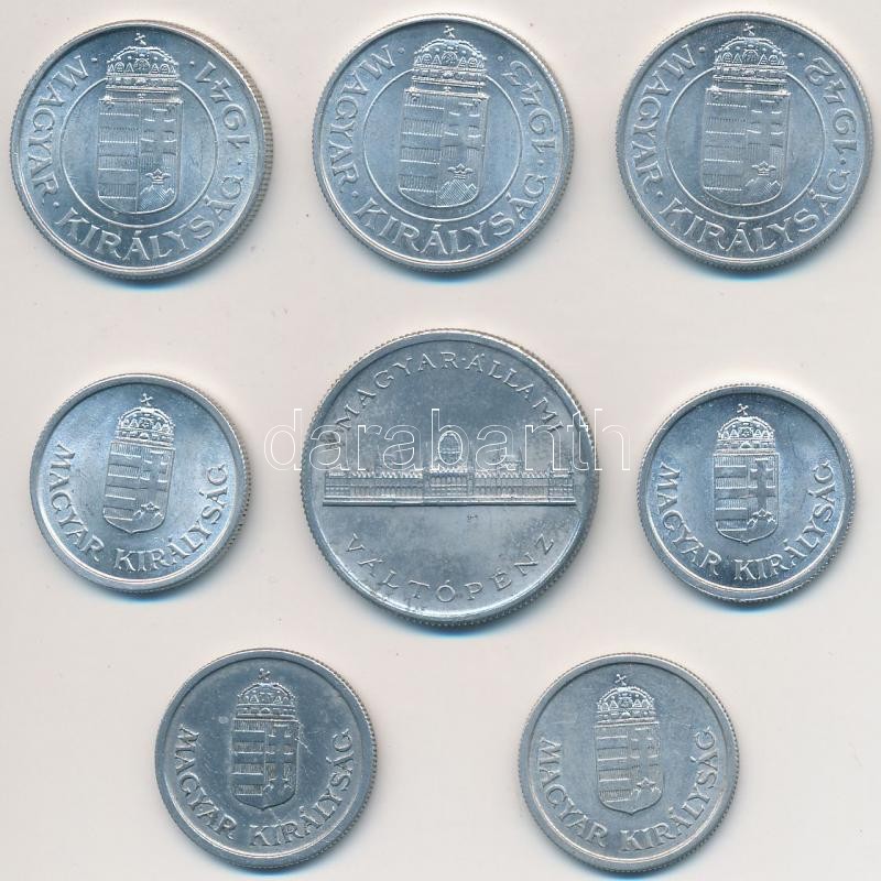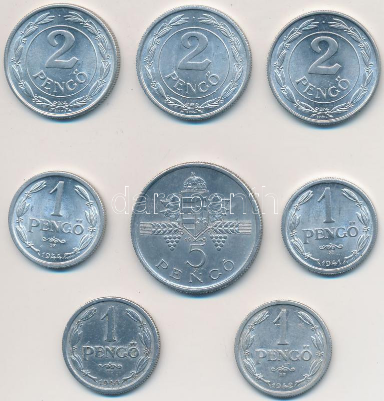 1941-1945. 1P Al (4xklf) + 2P Al (3xklf) + 5P Al T:2 https://www.darabanth.com/hu/227-Gyorsarveres/227.0/Numizmatika/Magyar-fem-es-ezustpenzek~600009/1941-1945-1P-Al-4xklf-plus-2P-Al-3xklf-plus-5P-Al-T2~II1003759