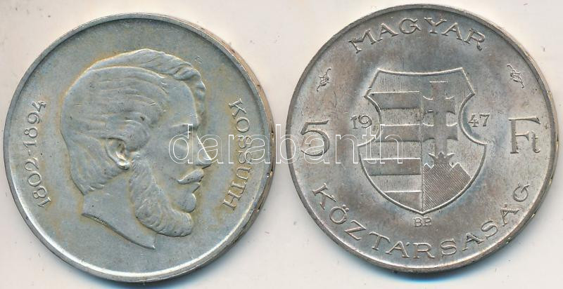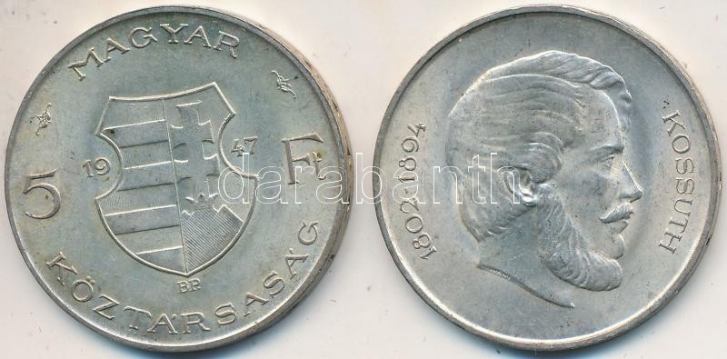 Leírás: 1947. 5Ft Ag "Kossuth" (2x) T:2,2-