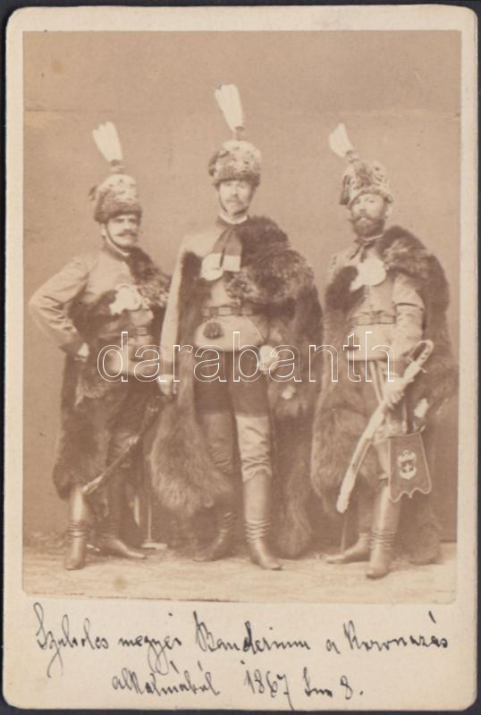 Leírás: 1867 Szabolcs megyei Bandérium a koronázás alkalmából, június 8-án, keményhátú fotó, feliratozva, 6x10 cm