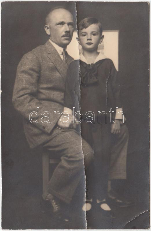 Leírás: 1925 Szentgyörgyi István(1881-1938) szobrászművész kisfiával, hátoldalon feliratozva, fotólap, felületén törésnyom, 9x13 cm