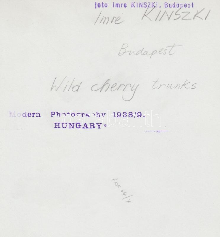 cca 1937 Kinszki Imre (1901-1945): Wild Cherry Trunks, feliratozott, pecséttel jelzett vintage fotóművészeti alkotás, publikálva a Modern Photography 1938/9. számában, 22x16 cm