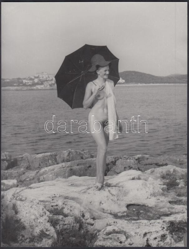 Leírás: cca 1980 Nudizó hölgy kelléktára, finoman erotikus fénykép, 24x18 cm /