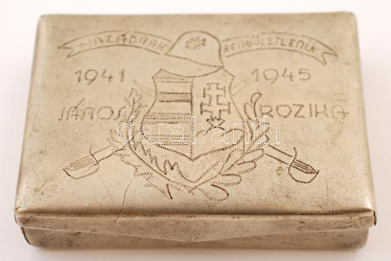1945 Alpakka cigarettatartó, két oldalán katonai motívumos díszítéssel... https://www.darabanth.com/hu/228-Gyorsarveres/228.0/Festmeny-mutargy-papirregiseg-egyeb/Militaria~3/1945-Alpakka-cigarettatarto-ket-oldalan-katonai-motivumos-diszitessel-feliratokkal-9C3976-5C3~II1018181