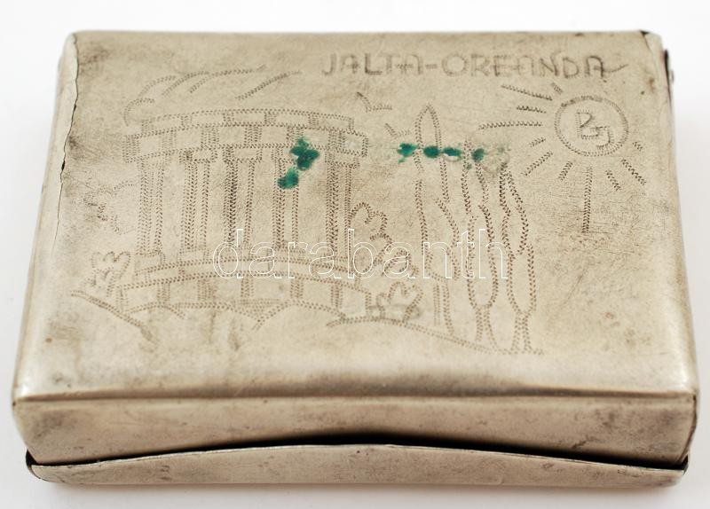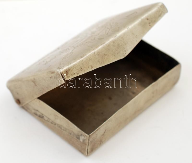 Leírás: 1945 Alpakka cigarettatartó, két oldalán katonai motívumos díszítéssel, feliratokkal, 9×6,5×2,5 cm