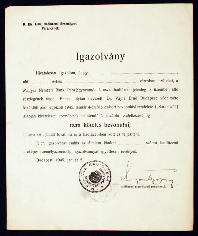 Leírás: 1945 Bp., M. Kir. Hadüzemi Parancsnok által kiadott formanyomtatvány bevonulási kötelezettség alól való felmentésről