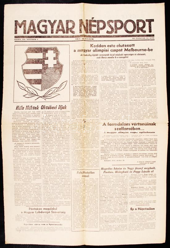 1956 Magyar Népsport c. lap november 1. száma a forradalom híreivel https://www.darabanth.com/hu/228-Gyorsarveres/228.0/Festmeny-mutargy-papirregiseg-egyeb/Nyomtatvanyok~5/1956-Magyar-Nepsport-c-lap-november-1-szama-a-forradalom-hireivel~II830640