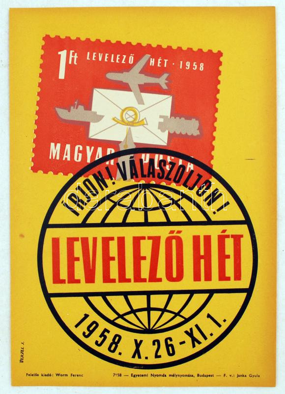 1958 "Írjon! Válaszoljon!" A levelező hetet népszerűsítő szórólap Vert... https://www.darabanth.com/hu/228-Gyorsarveres/228.0/Festmeny-mutargy-papirregiseg-egyeb/Nyomtatvanyok~5/1958-Irjon-Valaszoljon-A-levelezo-hetet-nepszerusito-szorolap-Vertel-Jozsef1922-1993~II1017894