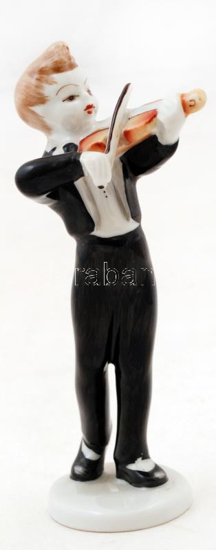 Leírás: Hollóházi hegedülő porcelán kisfiú, kézzel festett, jelzett, hibátlan, m: 14 cm