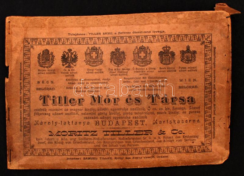 cca 1900 Tiller Mór és Társa egyenruha-kereskedő, császári és királyi udvari szállító, valamint több más (görög, szerb, perzsa) uralkodó udvari szállítója magyar és német nyelvű reklámtáblája, karton, kicsit vetemedett, kis szakadásokkal