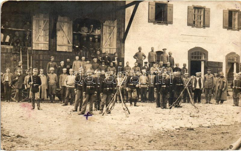 Leírás: 1916 Orosz hadifoglyok tábora, előtérben a magyar katonai őrség / Russian POWs' camp, Hungarian guards, photo (b)