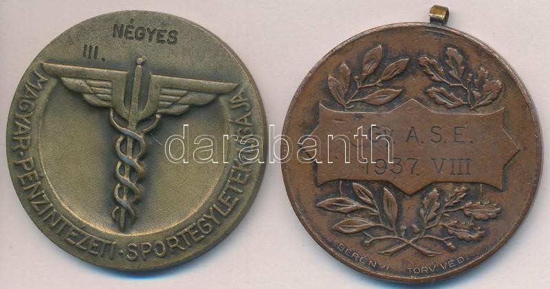 Leírás: Matskássy Gyula (1912-1971) ~1930-1940. "Bajnoki Érem / Magyar Pénzintézeti Sportegyletek Ligája - Négyes III." fém díjérem (50mm) + Berényi Lajos (1897-1957) 1937. "Gy. A. S.E. 1937. VIII" Br díjérem (40mm) T:2,3