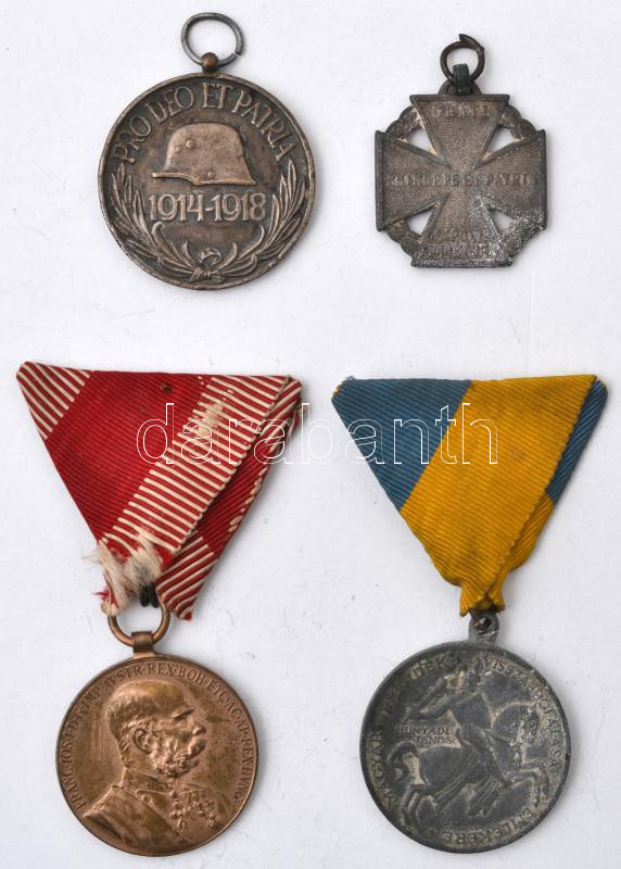 Osztrák-Magyar Monarchia 1898. "Jubileumi Emlékérem Fegyveres Erő Számára / Signum memoriae" Br kitüntetés, nem a saját mellszalagjával + 1916. "Károly-Csapatkereszt" cink kitüntetés mellszalag nélkül + 1929. Magyar Háborús Emlékérem kardokkal, sisakkal "Pro Deo et Patria" hadifém kitüntetés mellszalag nélkül + 1941. "Délvidéki Emlékérem" cink emlékérem mellszalaggal. Szign.: BERÁN L. T:2-,3,3-