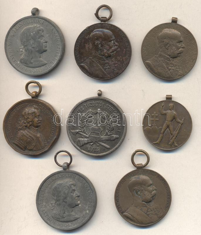 Leírás: Vegyes militária és falerisztika tétel 8db medállal, mellszalagok nélkül, közte 1938. "Felvidéki Emlékérem - II. Rákóczi Ferenc" Br emlékérem, 1940. "Erdélyi részek felszabadulásának emlékére" cink emlékérem T:vegyes