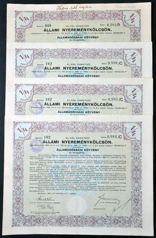 Leírás: Budapest 1941. "4%-kal kamatozó állami nyereménykölcsön - államadóssági kötvény" 50P-ről (4x) szelvényekkel T:I-
