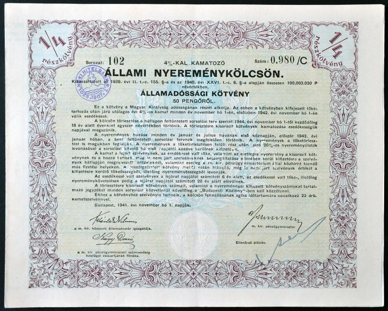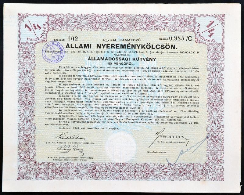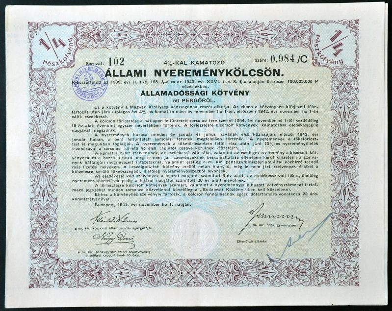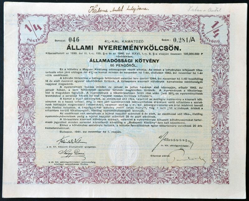 Budapest 1941. "4%-kal kamatozó állami nyereménykölcsön - államadósság... https://www.darabanth.com/hu/228-Gyorsarveres/228.0/Numizmatika/Reszvenyek-es-sorsjegyek~67/Budapest-1941-425-kal-kamatozo-allami-nyeremenykolcson--allamadossagi-kotveny-50P-rol-~II1019890