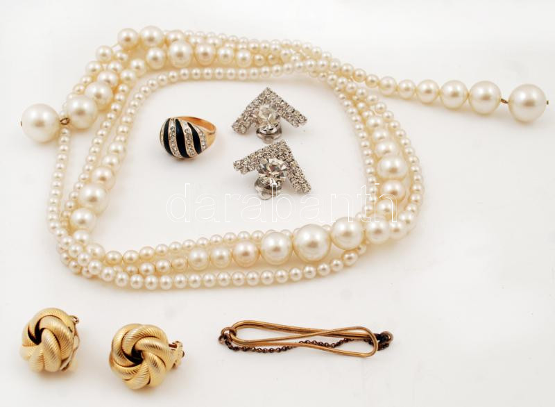 Leírás: Bizsu tétel, benne: nyaklánc, egy szintetikus kövekkel díszített gyűrű, 2 pár fülbevaló, 1 nyakkendő dísz, összesen: 7 db