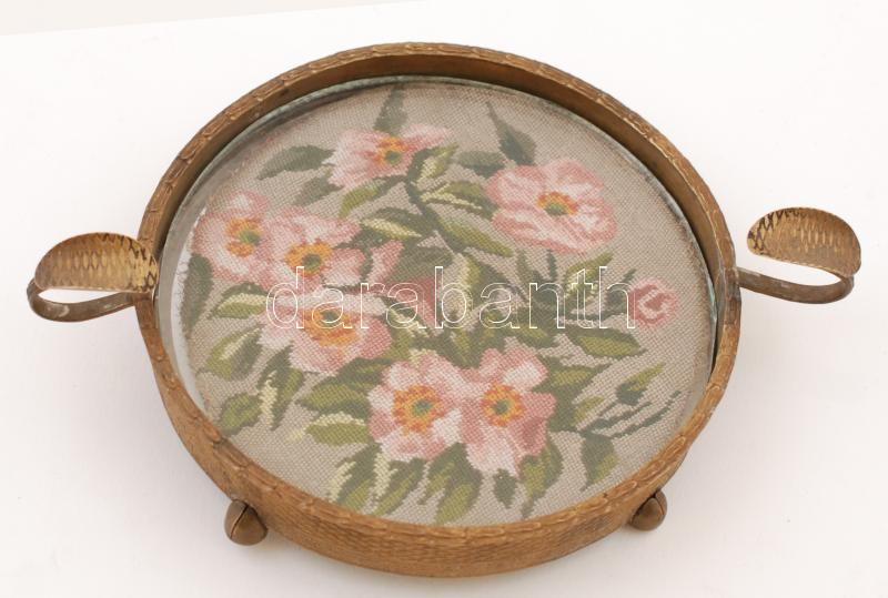 Leírás: Bronzírozott fém hamutál, gobelinnel díszített, d:120mm, az egyik tartóláb hiányzik