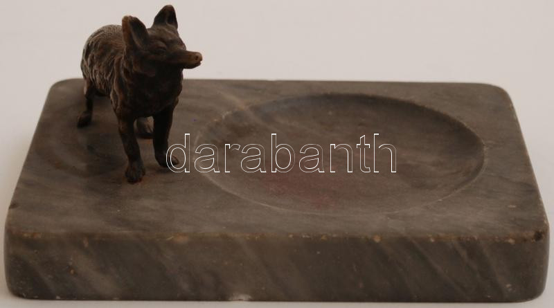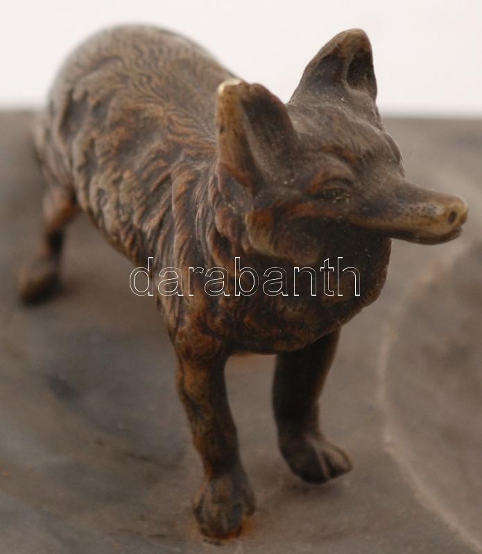 Leírás: Iratkapocstartó, alabástrom, réz rókával díszített, jelzés nélkül, kopásnyomokkal, lepattanásokkal, 15x11cm