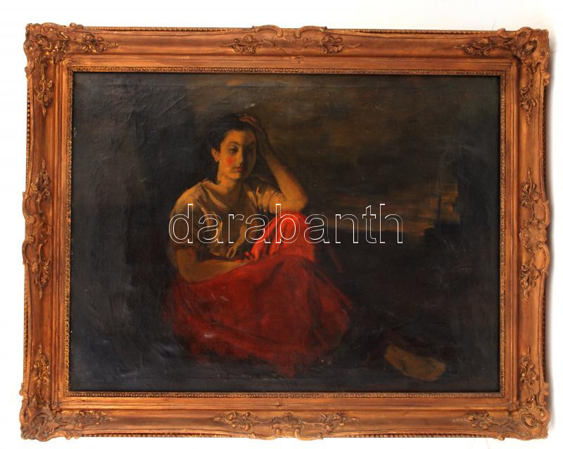 Leírás: Szüle Péter (1886-1944): Merengő. Olaj, vászon, jelzett, javított vászon, antik keretben, 60×80 cm