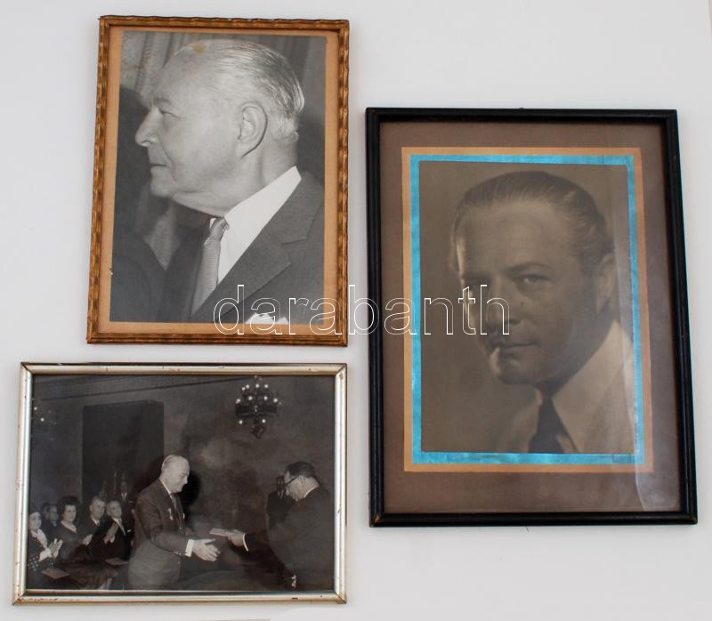 Leírás: 3 db fotó Fenyő Emil (1889-1980) színész, filmrendezőről, üvegezett keretekben, különböző méretben