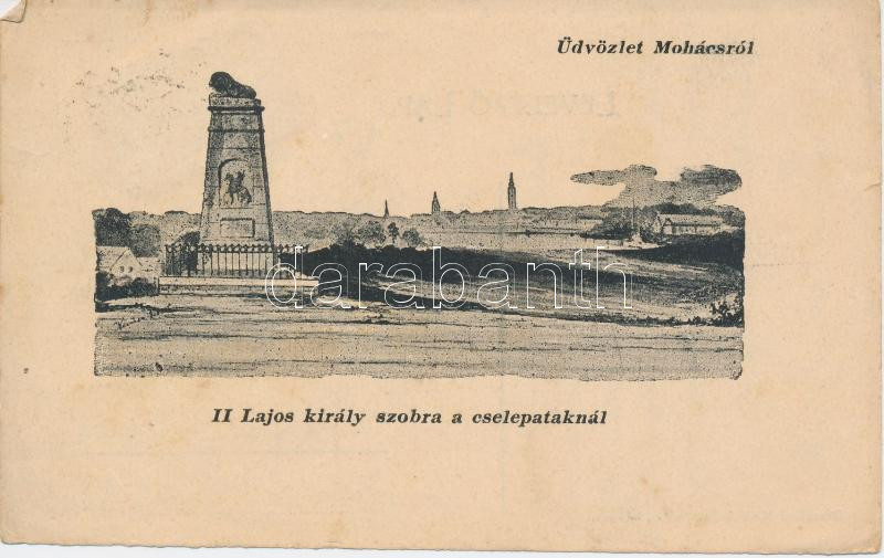 Leírás: Mohács, II. Lajos király szobra a Csele pataknál, kiadja Rosenthal Márk és fia (b)