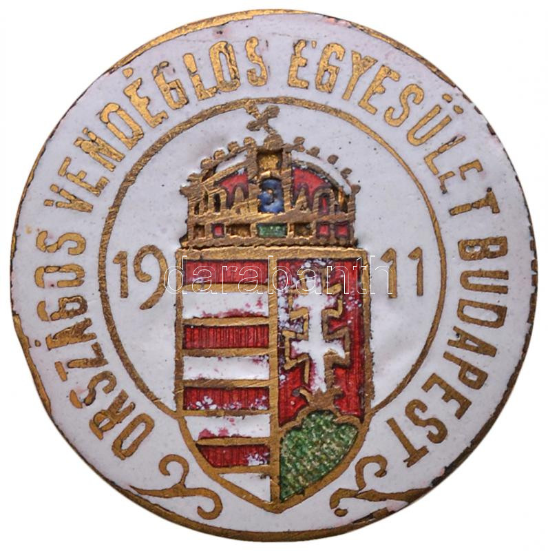 1911. "Országos Vendéglős Egyesület Budapest 1911" zománcozott, aranyozott Br jelvény, hátoldalán "BERGER JELVÉNY-GY. BUDAPEST VII. KAZINCY U. 10" gyártói jelzéssel (23,5mm) T:2- zománchiba