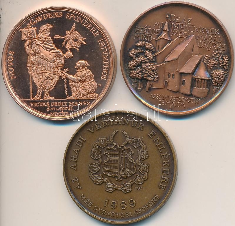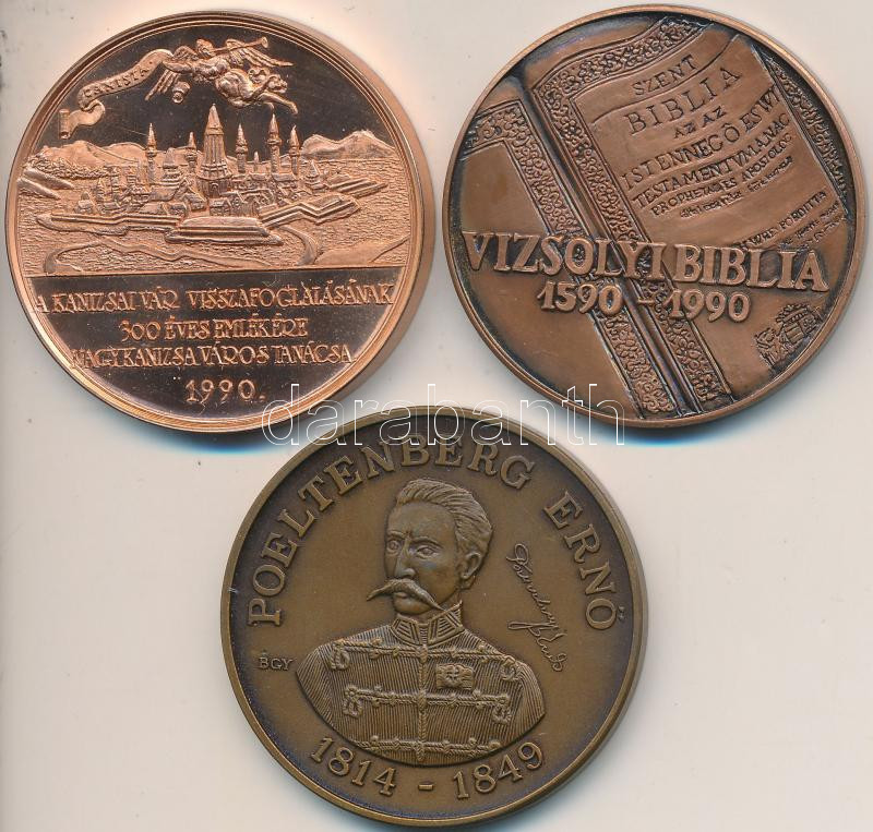 Leírás: Bognár György (1944-) 1989. "MÉE Gyöngyösi Csoport - Aradi Vértanúk / Poeltenberg Ernő" Br emlékérem (42,5mm) + Varga Éva (1949-) 1990. "Vizsolyi Biblia" Br emlékérem (42,5mm) + 1990. "Kanizsai Vár Visszafoglalásának 300 Éves Emlékére Nagykanizsa Város Tanácsa" Br emlékérem (42,5mm) T:1,1-,PP