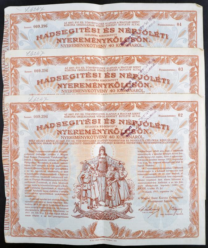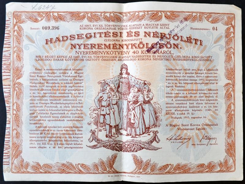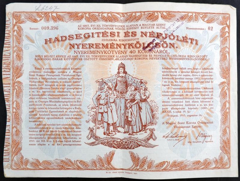 Leírás: Budapest 1917. "Hadsegítési és Népjóléti nyereménykölcsön" nyereménykötvény 40K-ról, szárazpecséttel és felülbélyegzéssel (3x) sorszámkövetők T:II-