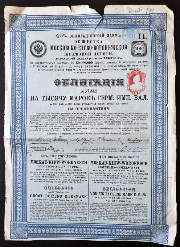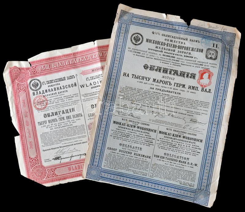 Orosz Birodalom / Szentpétervár 1895. "Vladikavkaz Vasúttársaság 4%-os Kötvénye" 1000M-ról, bélyegzéssel és szárazpecséttel + Moszkva 1909. "Moszka-Kijev-Voronyezs Vasúttársaság 4 1/2%-os Kötvénye" 1000M-ról, szelvényekkel, bélyegzéssel és szárazpecséttel T:III-