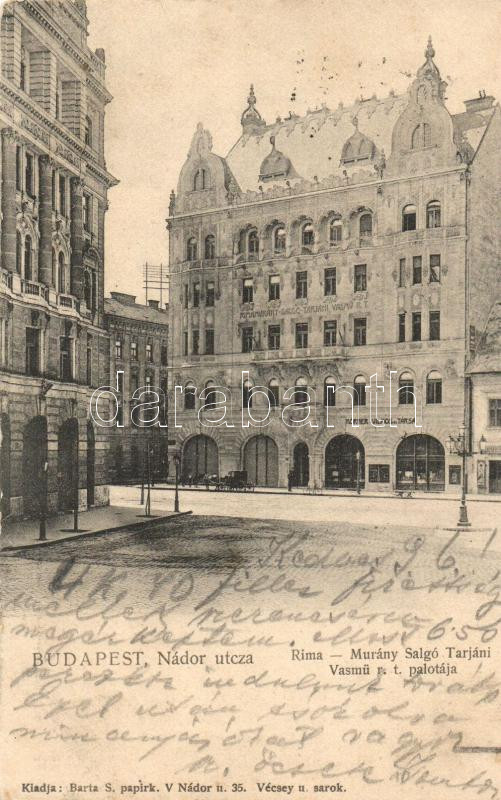 Leírás: Budapest V. Nádor utca, Rimamurányi-Salgótarjáni vasmű Rt. palotája, Körner Vilmos és társa üzlete, kiadja Barta S.