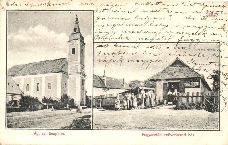 Szügy, Ágostoni evangélikus templom, Fogyasztási szövetkezeti ház https://www.darabanth.com/hu/23-Nagyaukcio/23.1/Magyar-kepeslapok/Magyarorszag~9033/Szugy-Agostoni-evangelikus-templom-Fogyasztasi-szovetkezeti-haz~II1202249