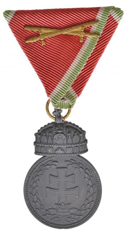 Hungary 1939-1945. "Hungarian Bronze Medal with the Holy Crown on a war ribbon with swords" gold plated war metal decoration with ribon and swords C:XF worn gilding