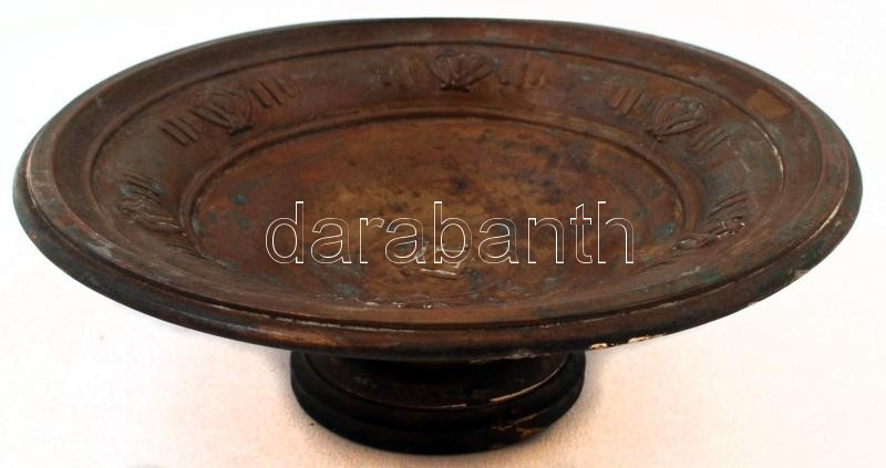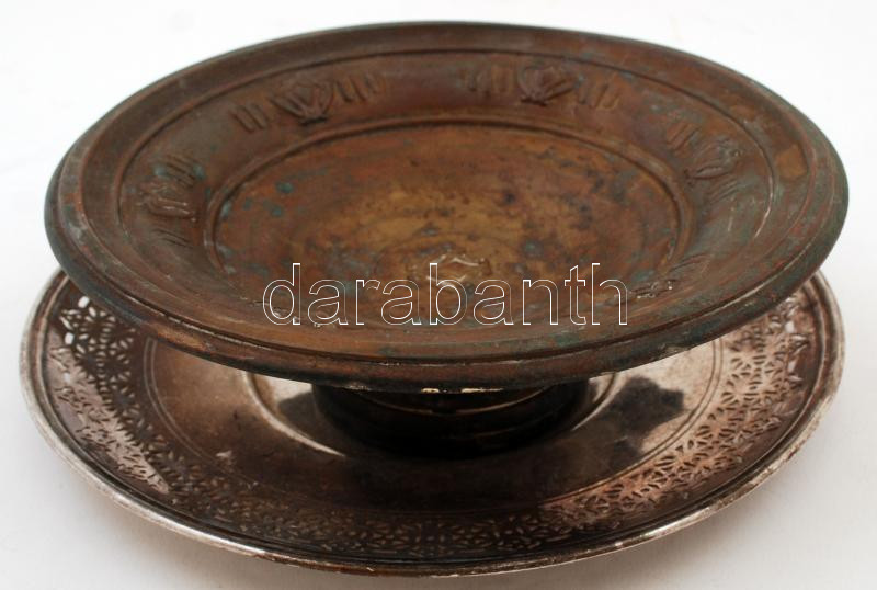 Leírás: 1 db áttört fém tányér, "Means Best" jelzéssel, d: 25 cm + talpas fém tál, jelzés nélkül, kopásnyomokkal, d: 22,5 cm