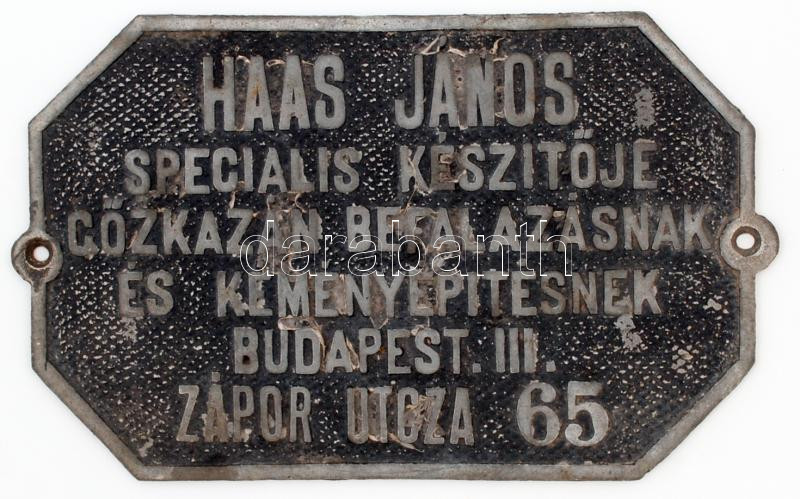 Leírás: "Haas János speciális készítője gőzkazán befalazásának és kéményépítésnek Budapest III. Zápor utcza 65." régi fém cégtábla, 23x15 cm