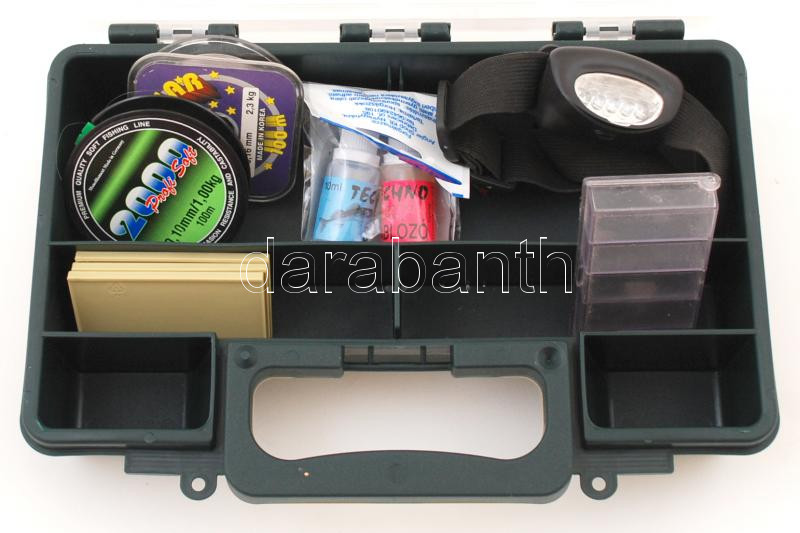 Leírás: Horgász szett: damilok, különféle cseppek (süllő, rablózó), elemek, stb. egy műanyag táskában