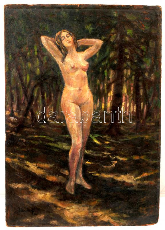 Leírás: Domián Árpád (1909-1939): Női akt az erdőben. Olaj, karton, jelzett, 72×51 cm