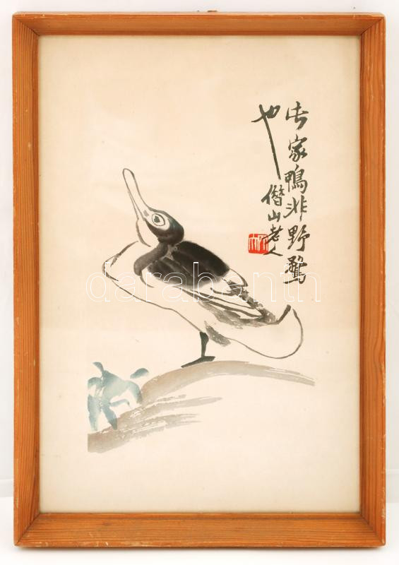 Leírás: Kacsa a tóparton, kínai vagy japán akvarell, papír, jelzett, üvegezett fa keretben, 36×24,5 cm