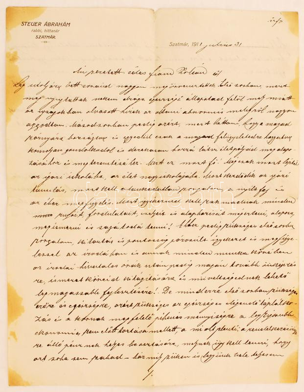 1912 Szatmár,Steuer Ábrahám rabbi, hittanár saját kezű levele / Ábrahá... https://www.darabanth.com/hu/230-Gyorsarveres/230.0/Festmeny-mutargy-papirregiseg-egyeb/Judaika~200041/1912-Szatmar-Steuer-Abraham-rabbi-hittanar-sajat-kezu-levele-Abraham-Steuer-rabbis-lette~II965928