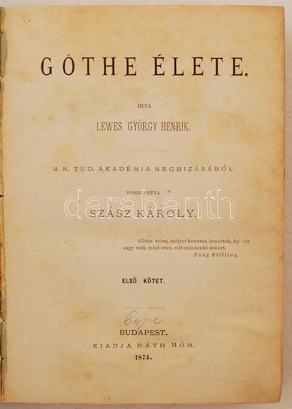 Lewes György Henrik: Göthe élete. I-II. Fordította: Szász Károly. Buda...